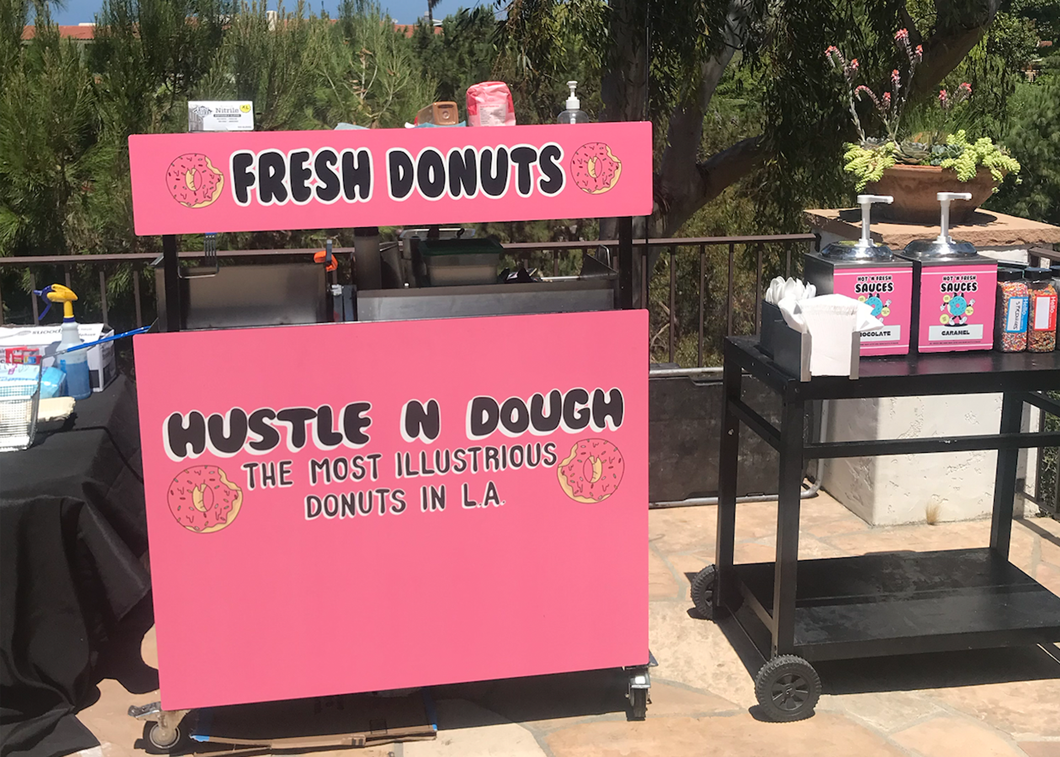 LIL PINK DONUT CART IS EQUIPPED WITH A FRYER ALLOWING FOR HOLES or MINI DONUTS TO BE MADE FRESH ON THE SPOT. great for INSIDE Or out made to order donuts for your guests can’t be beat.